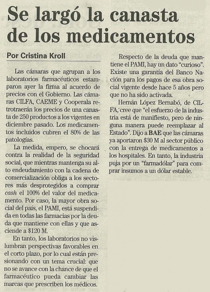 Las cámaras que agrupan a los laboratorios farmacéuticos estamparon ayer la firma al acuerdo de precios con el Gobierno. Las cámaras CILFA, CAEME y Cooperala retrotraerán los precios de una canasta de 250 productos a los vigentes en diciembre pasado. Los medicamentos incluidos cubren el 80% de las patologías.