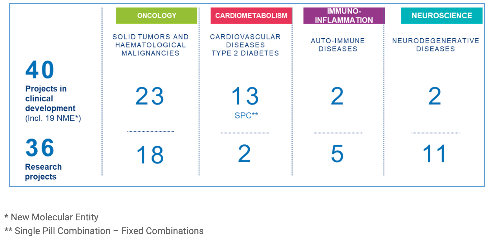 Entre las etiquetas más vendidas del 2021 figuran Daflon, por € 473 millones; Diamicron, con € 441 millones; Coversyl, que exhibió ingresos por € 269 millones; Preterax, que le devolvió € 266 millones, y Oncaspar, que anotó € 262 millones. En lo que respecta a proyectos de investigación y desarrollo, los de Onco encabezan el listado, seguido de los de Cardio-metabolismo.