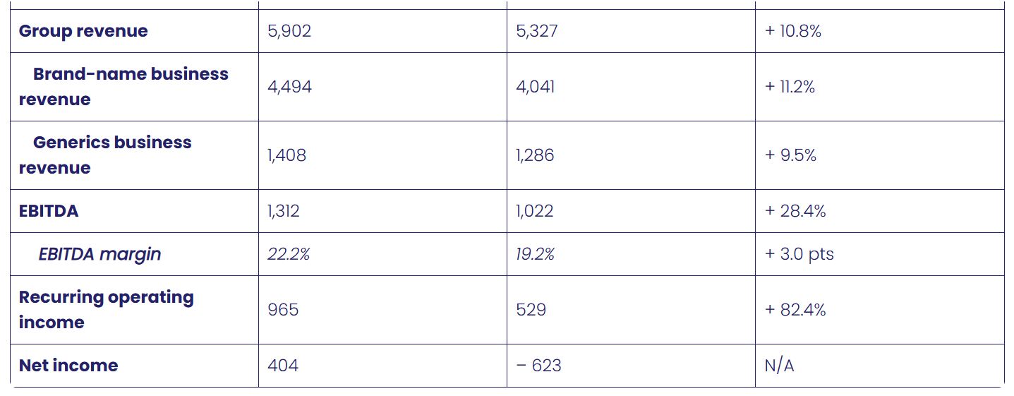 Su negocio de medicamentos de marca registró una suba del 11,2% a €4.494 millones, con una participación del 76,1% sobre el total de la facturación. En tanto su unidad de genéricos ascendió un 9,5% a €1.408 millones, lo que representó un aporte a la caja de la francesa del 23,9%.