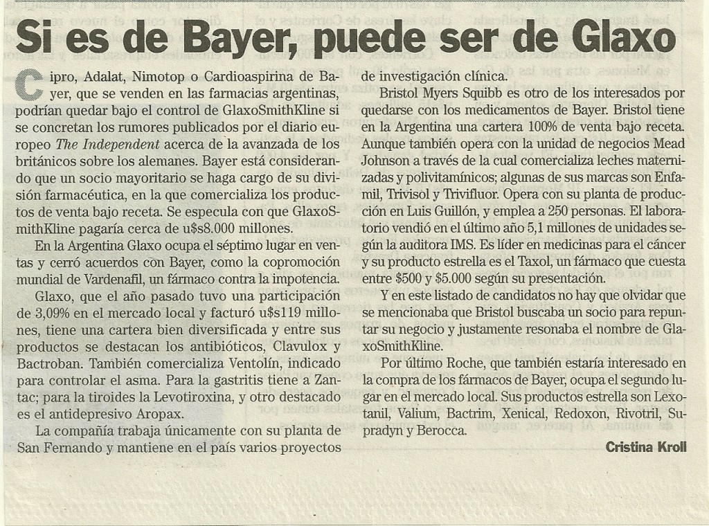 Cipro, Adalat, Nimotop o Cardioaspirina de Bayer, que se venden en las farmacias argentinas, podrían quedar bajo el control de GlaxoSmithKline si se concretan los rumores publicados por el diario europeo The Independent acerca de la avanzada de los británicos sobre los alemanes. Bayer está considerando que un socio mayoritario se haga cargo de su división farmacéutica, en la que comercializa los productos de venta bajo receta. Se especula con que GlaxoSmithKline pagaría cerca de u$s8.000 millones.