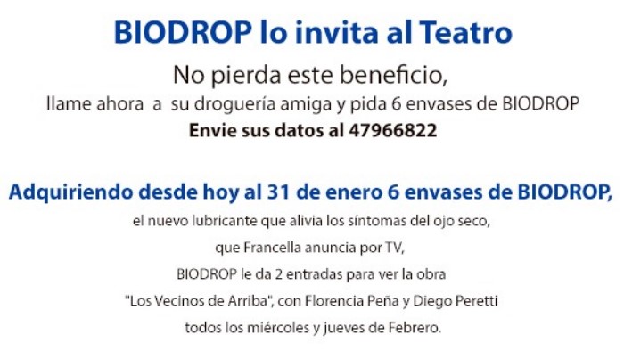 Luego de reclutar a Guillermo Francella para su nuevo mini spot publicitario, la compañía salió con una iniciativa para sus clientes. A fin de estimular las ventas de sus gotas oftalmológicas Biodrop ofrece entradas para el teatro. Ver artículo