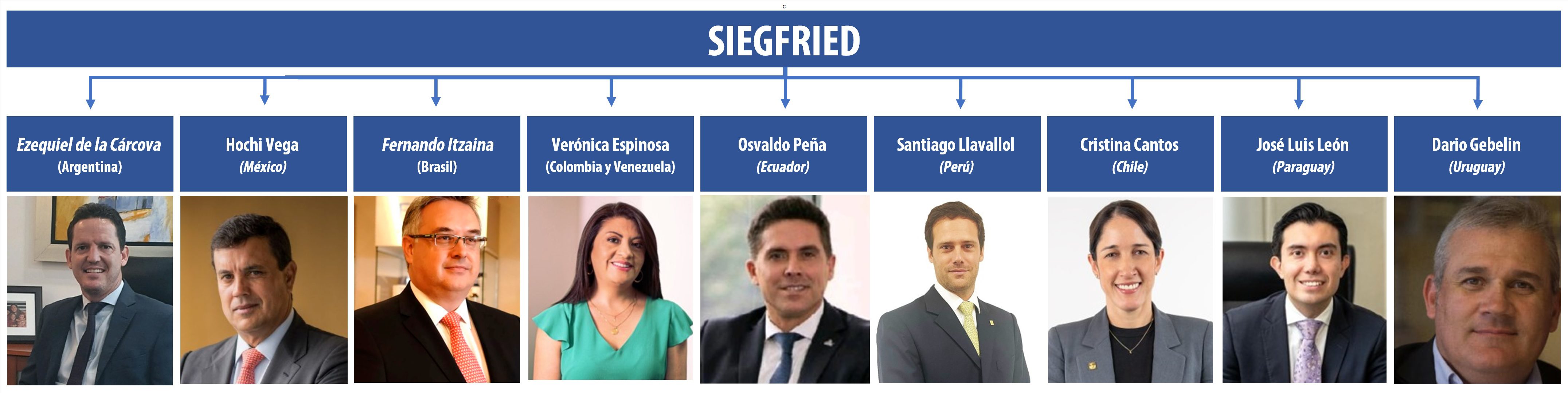 En la Argentina el referente es Ezequiel de la Cárcova. En Cono Sur, Uruguay está bajo las órdenes de Darío Gebelin. El resto del organigrama Siegfried en el continente se conforma del siguiente modo. México está a cargo de Hochi Vega; en Brasil, mediante su filial Farmoquímica el responsable es Fernando Itzaina; en Ecuador la cabeza es Osvaldo Peña y en Perú el que manda es Santiago Llavallol.