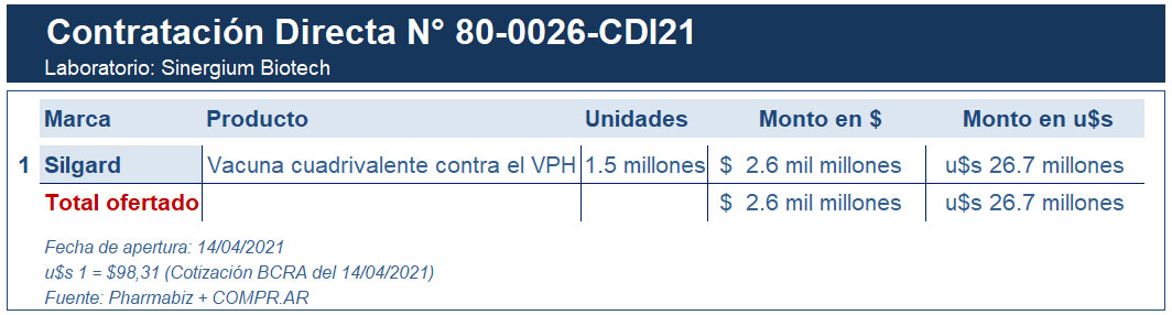 En enero del 2020, el Ministerio de Salud de la Nación -comandado en ese entonces por Ginés González García– le había puesto la firma a la ampliación de una licitación pública originada en el 2014 para adquirir más partidas de la vacuna contra el virus del papiloma humano. El contrato inicial suscripto durante la gestión de Cristina Fernández de Kirchner se amplió en el 2020 en un 13.88%, lo que significó la compra de 1.5 millones de dosis de Silgard VPH, equivalentes a $1.741 millones (u$s 27.6 millones*). Ver artículo.
