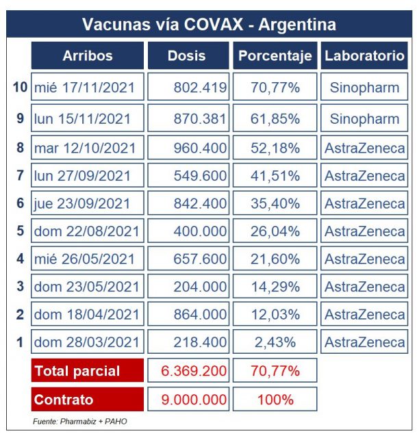 Con estos dos arribos, la Argentina recepcionaría un total de 1.6 millones de unidades esta semana, a través del mecanismo COVAX. Sin embargo, la plataforma oficial de la PAHO aún no refleja este dato. Esta situación se dio también en el mes de agosto, cuando una partida de vacunas de AZ, y que según el gobierno argentino se tramitaron mediante la OPS luego de ser donadas por España, tampoco encontraron registro en el panel de la PAHO. Ver artículo «Las COVAX de la semana, informe».