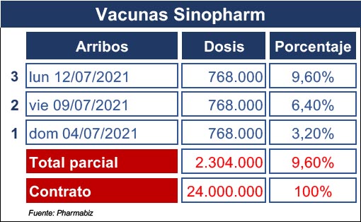 Las vacunas anti COVID-19 de la china Sinopharm siguen ingresando al país mediante partidas parciales. Después de que el domingo 4 y el viernes 9 de julio arribaran dos de los 10 vuelos programados, hoy lunes 12 de julio se sumó el tercero.