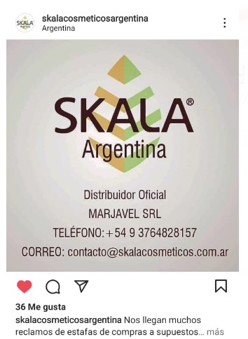 Desde la cuenta oficial de Instagram, Skala Cosméticos Argentina, dejó en claro que «nos llegan muchos reclamos de estafas de compras a supuestos distribuidores de Misiones«, y en ese espacio, recalcan que el único distribuidor en Misiones es la firma Baby Distribuidora. En Brasil, la marca es propiedad de Masterline, de Brasil.