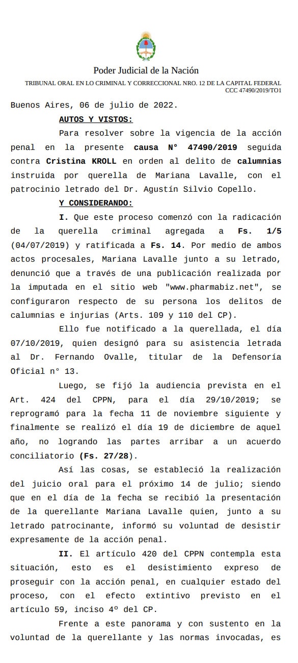 Ahora, y luego de tres años, la jueza Claudia Moscato, del Tribunal Criminal y Correccional Nº 12 dispuso el total sobreseimiento de Cristina Kroll, en orden al delito de calumnias e injurias, con costas a la acusación particular. Tras el desistimiento ante el Tribunal Oral en lo Criminal y Correccional N° 12 de la Capital Federal se dejó sin efecto el juicio oral que estaba previsto para el próximo jueves 14 de julio. En todo momento, la decisión de la directora y fundadora de Pharmabiz, con el respaldo del defensor público Fernando Ovalle, era avanzar hacia el juicio para defender su postura ante el tribunal. Pero ya sin fundamentos, la querella se bajó de la confrontación a tan solo siete días en que debía consumarse el juicio. Ver sobreseimiento