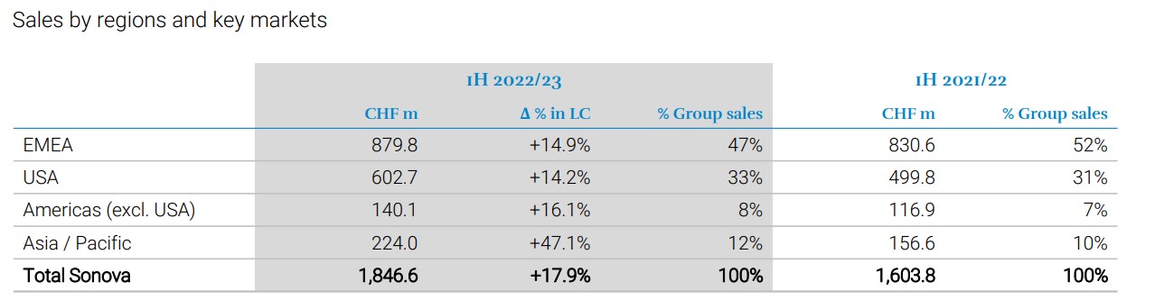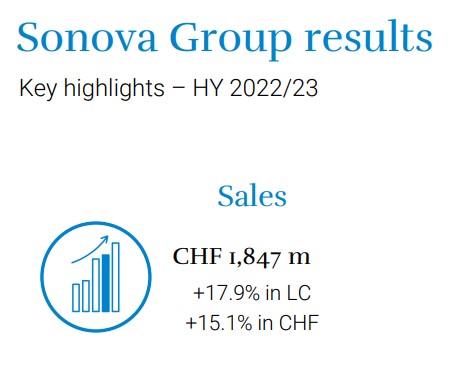 Las ventas del grupo alcanzaron los CHF 1.846,6 millones (u$s 1.960,9 millones) en la primera mitad del año fiscal 2022/23, un incremento del 17,9% en monedas locales y un 15,1% en francos suizos frente a igual lapso de su ejercicio anterior. Ver Press Release.