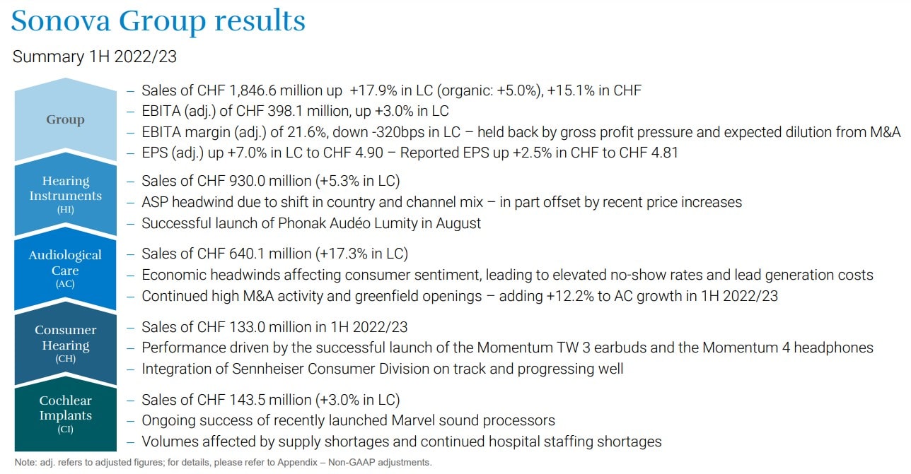 La suiza Sonova, especializada en soluciones para el cuidado de la audición, registró ventas por 1.846,6 millones de francos suizos (u$s 1.960,9 millones) en el primer semestre de su ejercicio 2022/3, concluido el pasado 30 de septiembre. La facturación creció un 15,1% interanual apuntalada por un sólido crecimiento orgánico del 5,0% y por la contribución de las últimas adquisiciones.