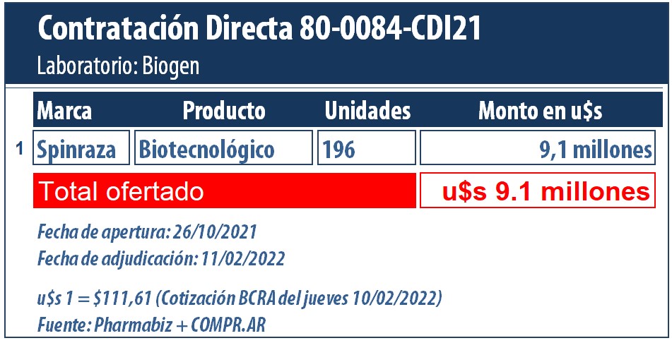 La compañía que había presentado su oferta en octubre del año pasado facturará más de u$s 9.1 millones. La compra de este medicamento de ultra costo, indicado para el tratamiento de la Atrofia Muscular Espinal -AME- tipo I y II y que a principios del año pasado se subió al programa de techs tuteladas, incluye además el servicio de logística y distribución con cadena de frío para el traslado de este producto a base de nusinersen. Ver artículo «Spinraza: tech tutelada»