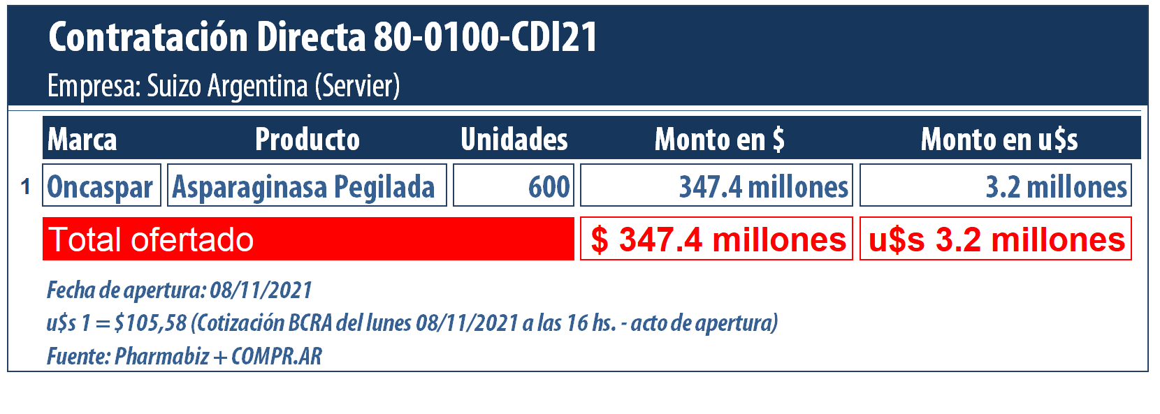 La última vez que la cartera encabezada por Carla Vizzotti abrió una compra pública por este producto fue en octubre del 2020. Dicho proceso fue adjudicado en diciembre pasado por una suma de $193.7 millones (u$s 2.1 millones*), equivalentes a 672 frascos ampolla de Oncaspar. En aquel momento también se había apuntado Suizo Argentina en nombre de Servier. Ver Antineoplásicos: Estado abre contratación.