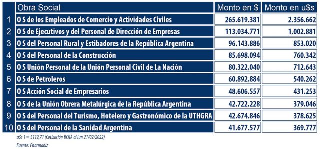 Con un giro de $ 265.6 millones (u$s 2.4 millones), la Obra Social de los Empleados de Comercio y Actividades Civiles encabezó una vez más la lista de las que más dinero percibirán. Detrás, se ubican la Obra Social de Ejecutivos y del Personal de Dirección de Empresas con una asistencia de $113.0 millones (u$s 1.0 millones) y la Obra Social del Personal Rural y Estibadores de la República Argentina con $96.1 millones (u$s 853 mil). Ver anexo.