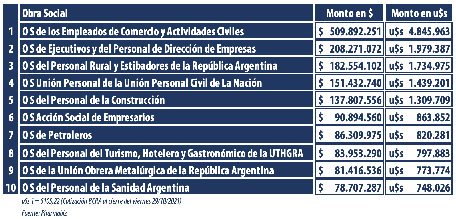 Con un giro de $509.9 millones (u$s 4.8 millones), la Obra Social de los Empleados de Comercio y Actividades Civiles se ubica una vez más a la cabeza de las que más dinero percibirán. Por debajo, nuevamente se encuentran la Obra Social de Ejecutivos y del Personal de Dirección de Empresas con un respaldo de $208.3 millones (u$s 2.0 millones) y la Obra Social del Personal Rural y Estibadores de la República Argentina con $182.6 millones (u$s 1.7 millones). Ver anexo.