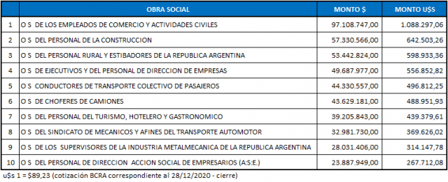 Atrás se ubicó la Obra Social del Personal de la Construcción que percibirá $57,3 millones (u$s 642,5 mil). En tercer lugar aparece la Obra Social del Personal Rural y Estibadores con $53,4 millones (u$s 598,9 mil).