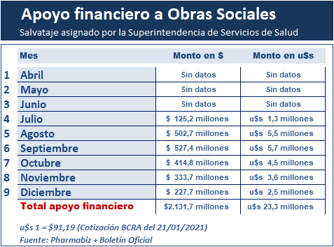 La Superintendencia de Servicios de Salud dispuso otorgar un apoyo financiero de excepción de $227.7 millones (u$s 2.4 millones) para 46 obras sociales que presentaron durante diciembre una recaudación inferior a la que registraron en marzo de 2020. Ver resolucíón 163.