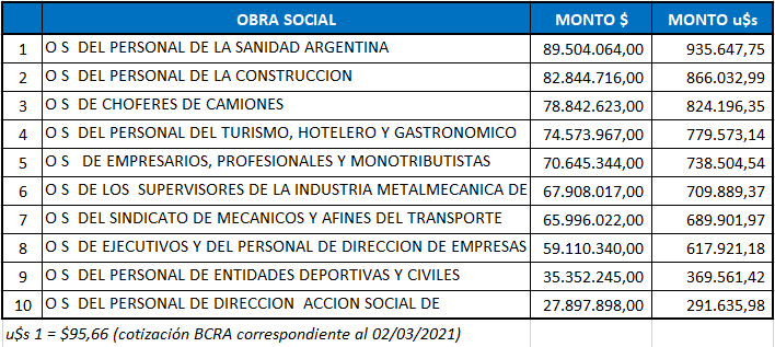 La que más fondos tendrá para acreditar será la Obra Social del Personal de Sanidad Argentina a la que le ingresarán $89.5 millones (u$s 935.6 mil). Segunda figura la Obra Social del Personal de la Construcción que recibirá $82.8 millones (u$s 866 mil); y en tercer lugar se lista la Obra Social de Choferes de Camiones que percibirá $78.8 millones (u$s 824.1 mil).