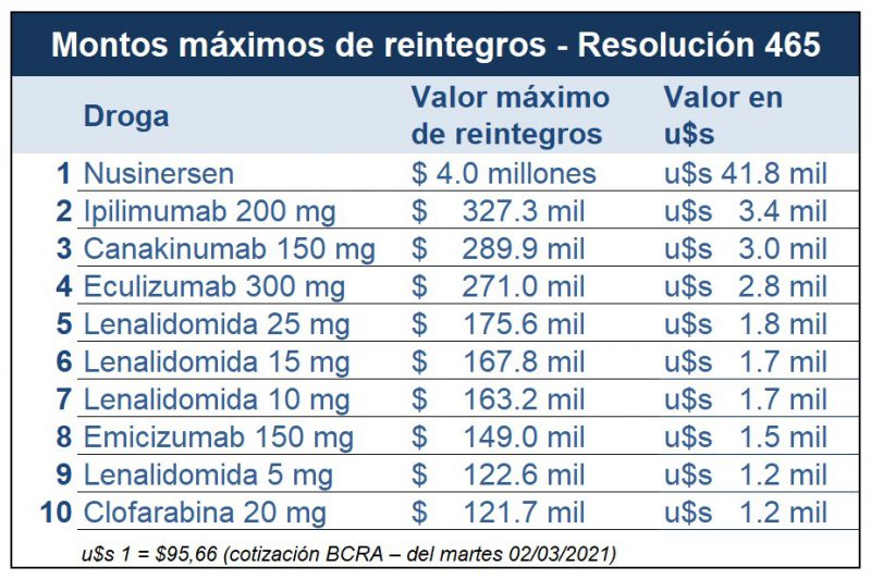 La normativa que comenzará a regir a partir de mañana jueves 4 de marzo, está conformada por un conjunto de listados que detallan los montos máximos de reintegros. Por caso, se define la nómina de drogas y tratamientos que son contemplados por el S.U.R. Allí figura que el mayor reintegro será para Spinraza, de Biogen, por $4 millones (u$s 41.8 mil). Le sigue el antineoplásico Yervoy, de BMS por $327.3 mil (u$s 3.4 mil) y en tercer lugar se encuentra el anticuerpo monoclonal Ilaris, de Novartis, por $289.9 mil (u$s 3 mil).
