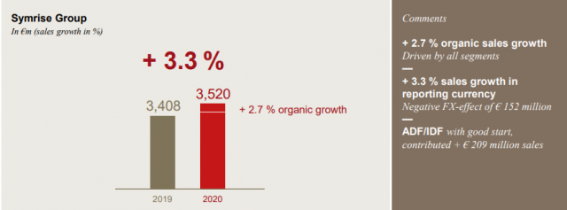 Symrise aumentó sus ventas anuales en el 2020 en un 2.7% en términos orgánicos en comparación al año anterior, con un monto de € 3.520 millones. Los ingresos de Scent & Care crecieron un 1.5%, mientas que los de Flavor se incrementaron un 0.7%. Nutrition fue la división estrella al mostrar una mejora del 8.2%.