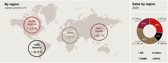 En cuanto a su performance por regiones, Latinoamérica quedó a la cabeza con un avance del 21.9% respecto del 2019. La multi que en la Argentina tiene su planta en el Parque Industrial de Tortuguitas consignó en su reporte anual que Latam le representó el 11% de su facturación total. El resto de las zonas registró una performance más moderada. Norteamérica ascendió un 2.1% y le significó a la empresa el 28% de la torta de ventas. Asia Pacífico subió un 0.7% y le entregó el 21% de los ingresos. Por último, Europa, África y Oriente Medio perdió un -1.5%, y le devolvió a Symrise un 40% del total.