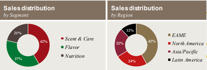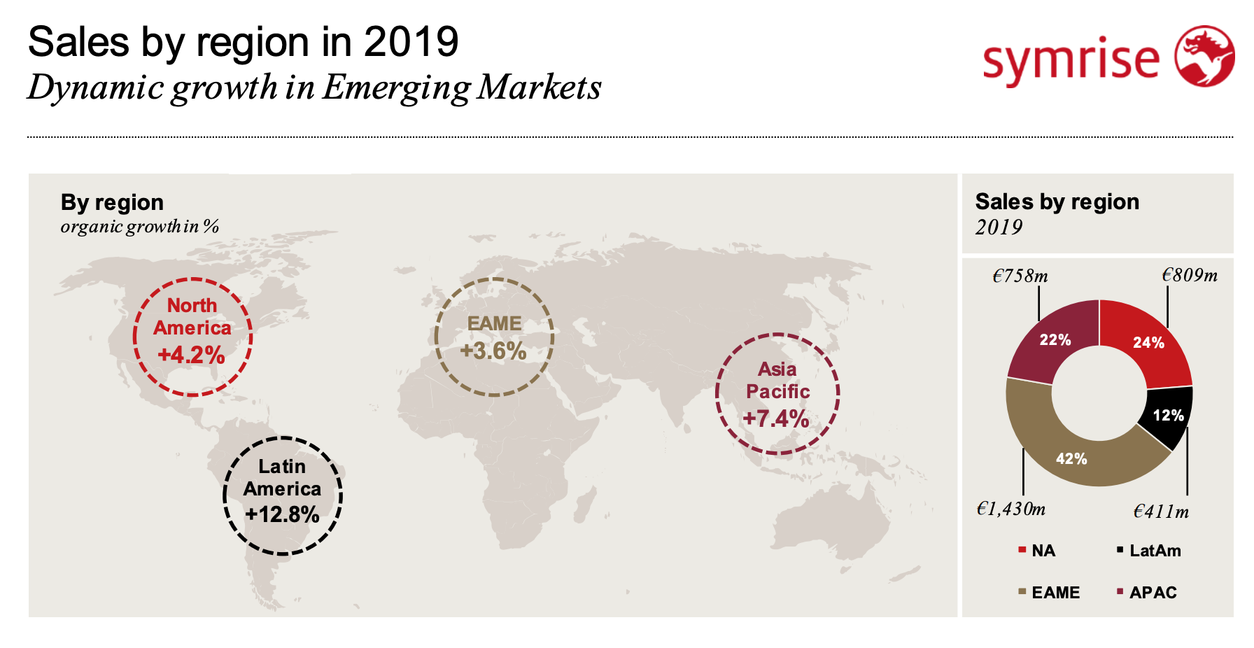 Le siguió Asia Pacífico que ascendió un 7.4% y le significó a la empresa el 22% de la torta de ventas. Cerca se ubicó Norteamérica que subió un 4.2% y le entregó el 24%. Por último, la zona conformada por Europa, África y Oriente Medio obtuvo un alza del 3.6% y le devolvió a Symrise un 42% del total.