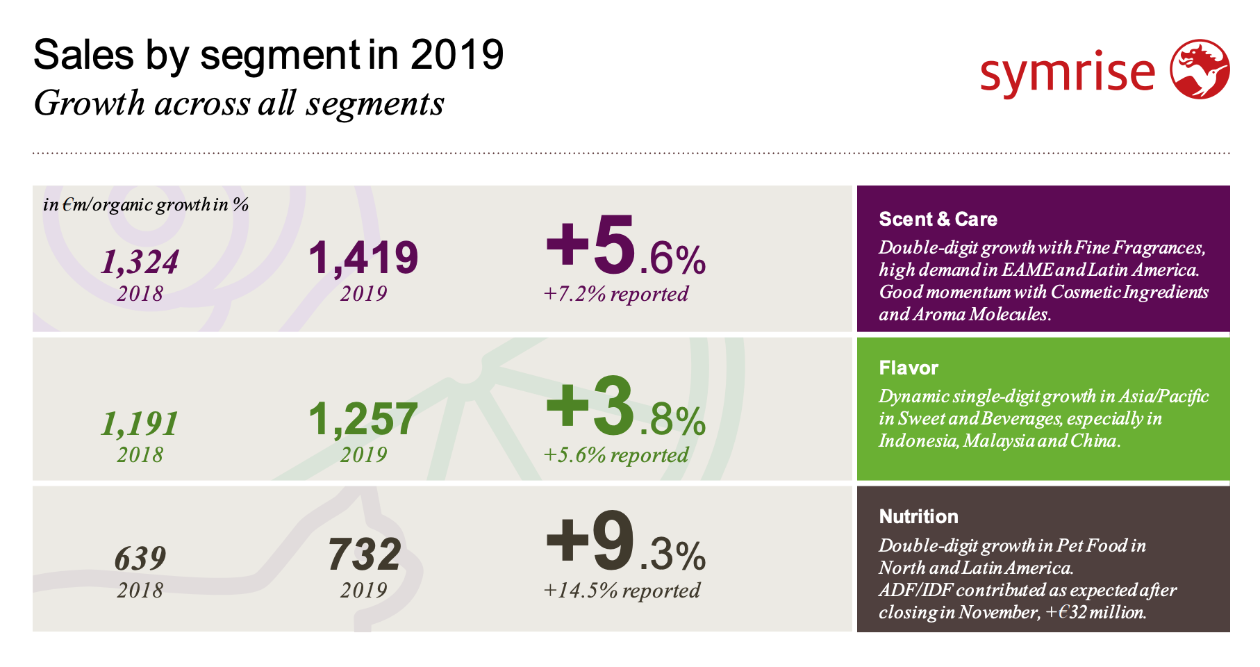 La fraganciera Symrise dijo que creció un 5.7% en ventas en el 2019. La región de Latinoamérica exhibió un ascenso del 12.8% respecto del 2018; mientras que la división de negocios que más facturó fue Scent & Care, la que incluye a su unidad de fragancias finas.