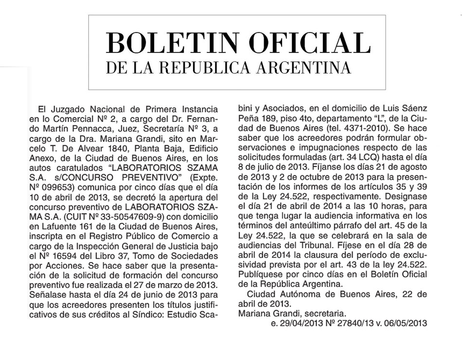 El laboratorio nacional Szama solicitó su concurso preventivo.