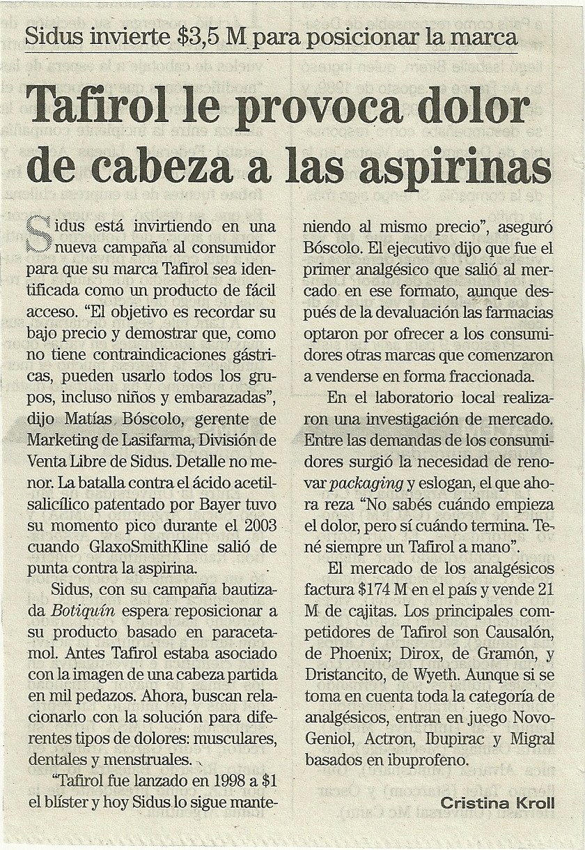 Sidus está invirtiendo en una nueva campaña al consumidor para que su marca Tafirol sea identificada como un producto de fácil acceso. «El objetivo es recordar su bajo precio y demostrar que, como no tiene contraindicaciones gástricas, pueden usarlo todos los grupos, incluso niños y embarazadas«, dijo Matías Bóscolo, gerente de Marketing de Lasifarma, División de Venta Libre de Sidus. Detalle no menor. La batalla contra el ácido acetilsalicílico patentado por Bayer tuvo su momento pico durante el 2003 cuando GlaxoSmithKline salió de punta contra la aspirina.