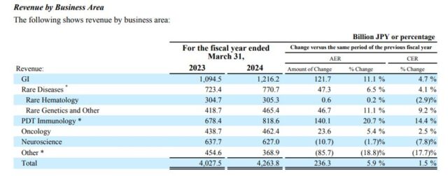 Las ventas de la japonesa Takeda registraron un incremento del 5,9% durante su último ejercicio completo cerrado el 31 de marzo de 2024. Para el año en curso espera que sus ingresos crezcan un 2,0%. Debido al fin de la exclusividad de algunos de sus principales medicamentos como Vyvanse, la multi anunció un plan de reestructuración para optimizar su fuerza laboral, reducir costos y fortalecer su wing tecnológico.