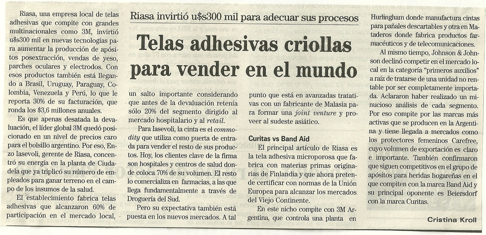 Riasa, una empresa local de telas adhesivas que compite con grandes multinacionales como 3M, invirtió u$s300 mil en nuevas tecnologías para aumentar la producción de apósitos posextracción, vendas de yeso, parches oculares y electrodos. Con esos productos también está llegando a Brasil, Uruguay, Paraguay, Colombia, Venezuela y Perú, lo que le reporta 30% de su facturación, que ronda los $3,6 millones anuales.