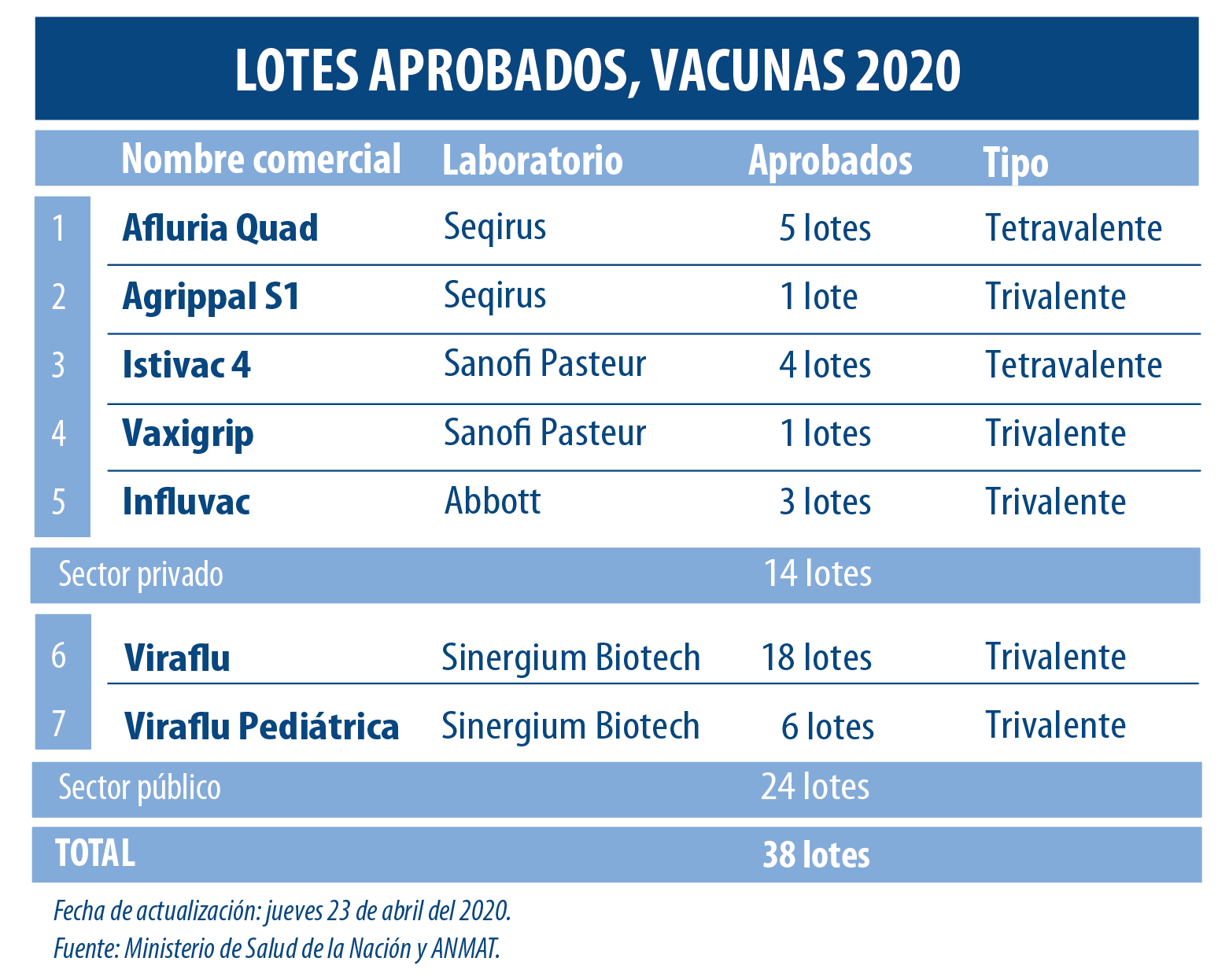 En paralelo, para el sector privado se dieron por aprobados 14 lotes a fin de ser comercializados en farmacias y vacunatorios. En este grupo figuran la australiana Seqirus con seis partidas -cinco de su tetravalente Afluria Quad y una de su trivalente Agrippal S1-. También la francesa Sanofi con cuatro partidas de su tetravalente Istivac 4; y una de su trivalente Vaxigrip. Por último, la norteamericana Abbott que se anotó con tres lotes de su trivalente Influvac.