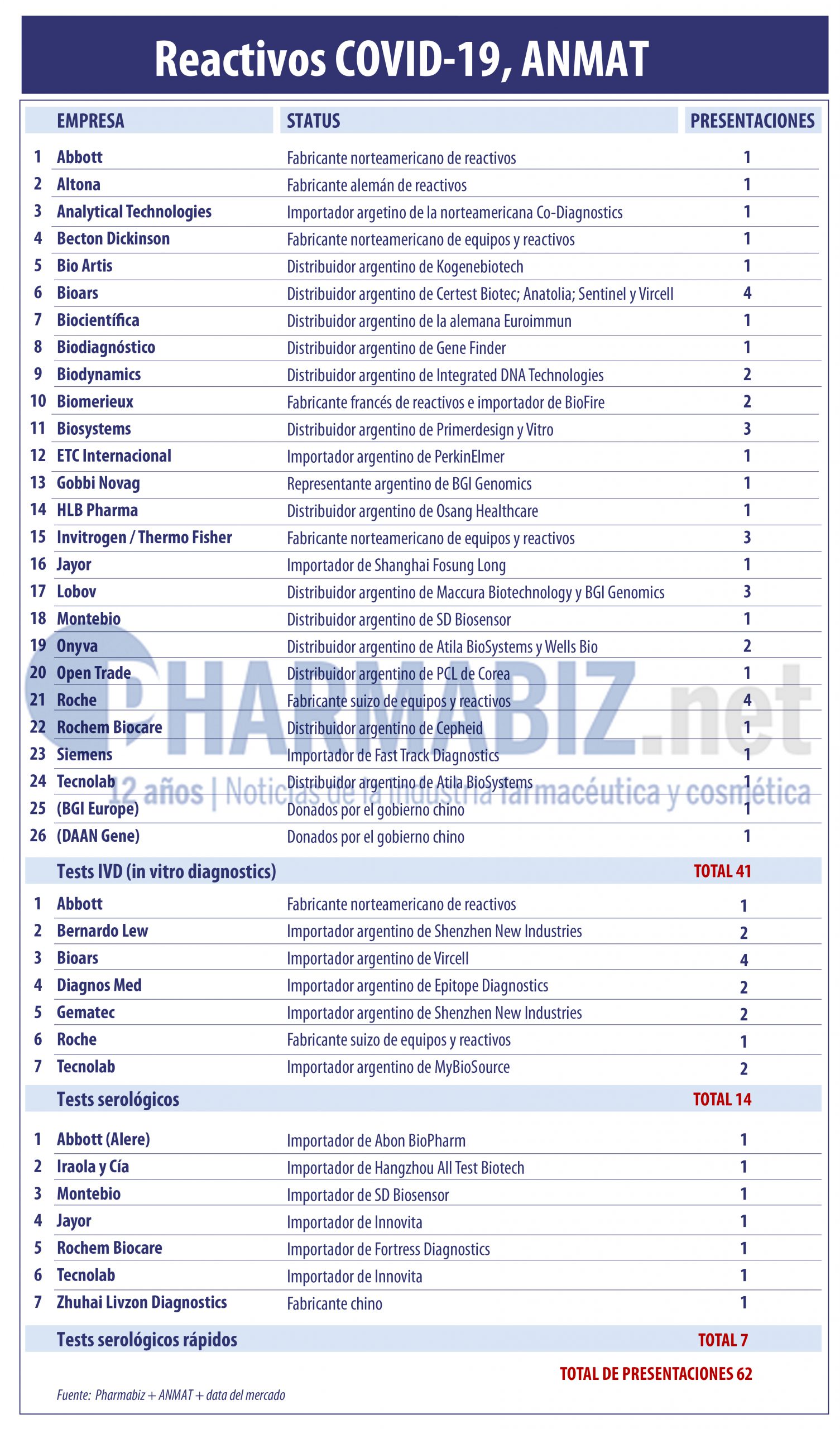 Asimismo y según el análisis realizado por Pharmabiz, en el renglón de los tests serológicos se agregaron dos multis. Por un lado, la norteamericana Abbott, que con su usina de Abbott Diagnostics trae además reactivos PCR desde el mes de abril. Lo mismo corre para la suiza Roche, que estaba consignada en el apartado IVD y que ahora se subió con sus pruebas serológicas.