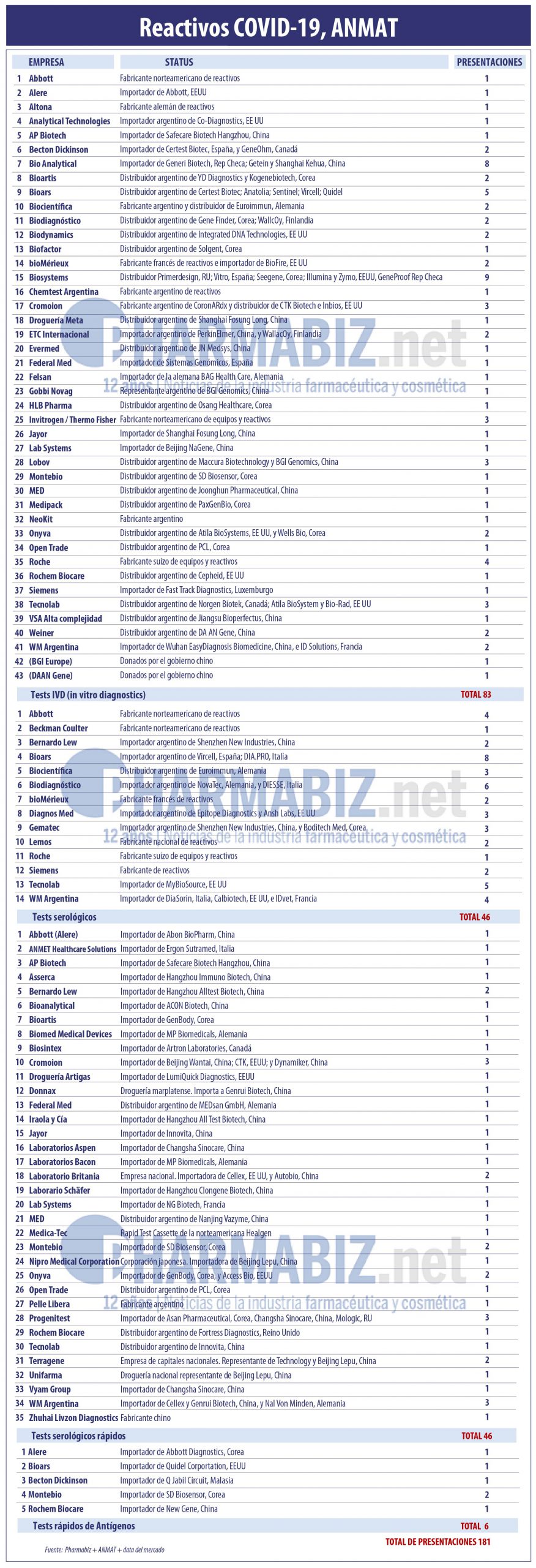 Por el lado de los serológicos rápidos, la nueva incorporación fue la de Bioanalytical con dispositivos de la china ACON Biotech. Asimismo, Bernardo Lew, propiedad de la familia Lew, sumó una segunda presentación de la china Hangzhou Alltest Biotech; mientras que Porgenitest recibió el sí para el test de la británica Mologic, y Terragene para el producto de la china Beijing Lepu.