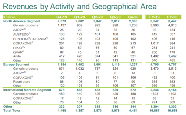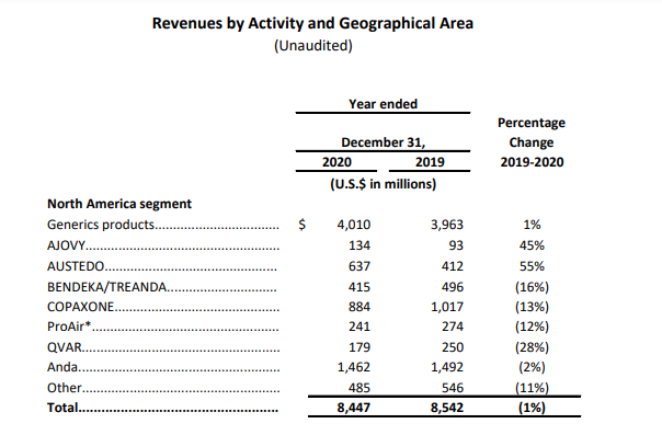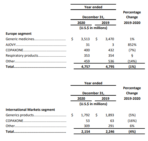 En su reporte financiero, la compañía dijo que la caida en ventas se debió principalmente a una disminución en los ingresos de ciertos productos oncológicos; de su blockbuster para esclerosis múltiple Copaxone y ciertas etiquetas respiratorias. La facturación también se vio afectada por la reducción de la demanda en algunas categorías como resultado del impacto de la pandemia COVID-19.