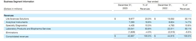Su segunda unidad en relevancia, Life Sciences Solutions, declinó un 26,3% a u$s 9.977 millones, con una participación del 23,3%. En tanto, Instrumentos Analíticos creció un 9,6% con ventas por u$s 7.263 millones y un peso del 16,9%. Por último, Specialty Diagnostics cayó un 7,5% a u$s 4.405 millones, con un aporte del 10,3%.