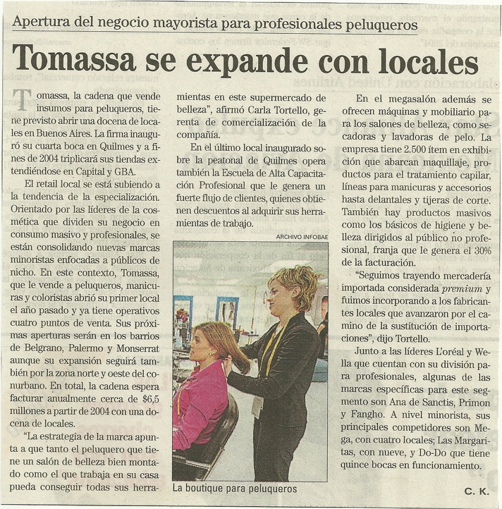 El retail local se está subiendo a la tendencia de la especialización. Orientado por las líderes de la cosmética que dividen su negocio en consumo masivo y profesionales, se están consolidando nuevas marcas minoristas enfocados a públicos de nicho. En este contexto, Tomassa, que le vende a peluqueros, manicuras y coloristas abrió a su primer local el año pasado y ya tiene operativos cuatro puntos de venta. Sus próximas aperturas serán en los barrios de Belgrano, Palermo y Monserrat aunque su expansión seguirá tan bien por la zona norte y oeste del conurbano. En total, la cadena espera facturar anualmente cerca de $6,5 millones a partir de 2004 con una docena de locales.