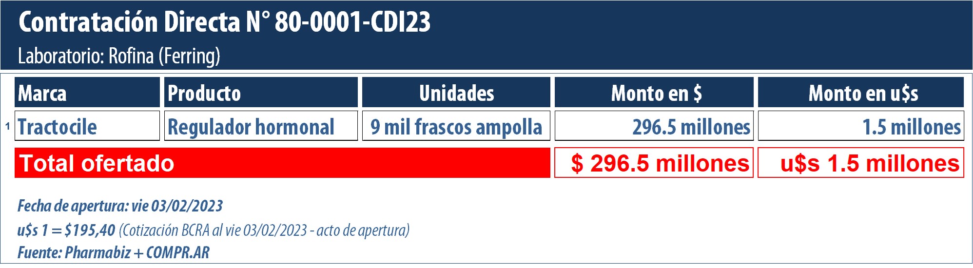 Se trata del inyectable Tractocile, de la suiza Ferring. En concreto, el Estado prevé abastecerse de 9 mil frascos ampolla en dos presentaciones, mediante un proceso que tiene como contraparte a la distribuidora Rofina. Por ello, la empresa podría percibir ingresos por $296.5 millones (u$s 1.5 millones). Ver Contratación // Ver Cuadro Comparativo.