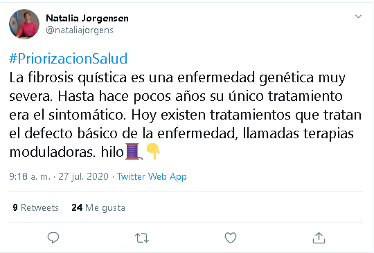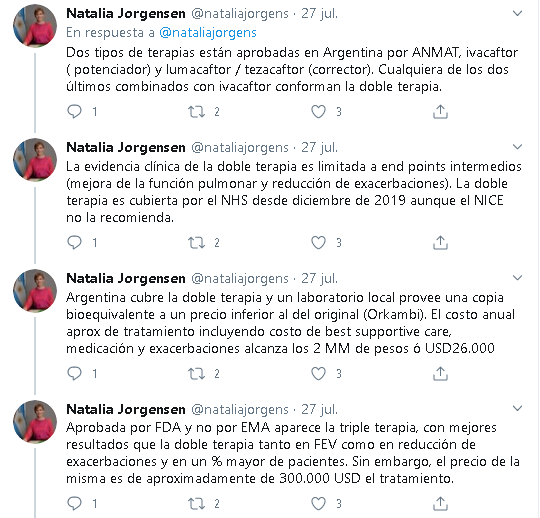 La consultora del Banco Interamericano de Desarrollo -BID- explicó en un extenso hilo de Twitter que hasta hace pocos años el tratamiento de la fibrosis quística apuntaba sólo a los síntomas y que en la actualidad existen las llamadas terapias moduladoras, con las que «se trata el defecto básico de la enfermedad». Ver tweets.