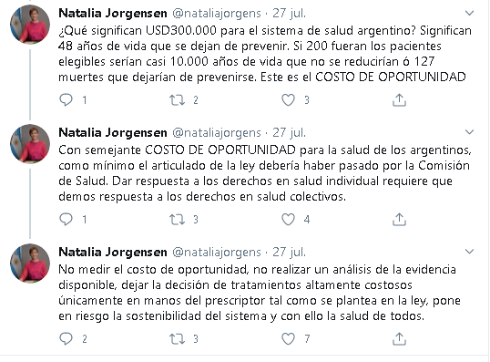La experta afirmó que «no medir el costo de oportunidad, no realizar un análisis de la evidencia disponible, dejar la decisión de tratamientos altamente costosos únicamente en manos del prescriptor» tal como quedó planteado tras la ley, «pone en riesgo la sostenibilidad del sistema». Además agregó que como mínimo el articulado de la ley debería haber pasado por la Comisión de Salud y que «dar respuesta a los derechos en salud individual requiere que demos respuesta a los derechos en salud colectivos».