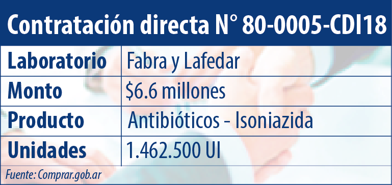 El Estado desembolsará más de $6.6 millones (u$s 239 mil) para la adquisición de antibióticos para la tuberculosis a base de isoniacida. La compra recayó en manos de los laboratorios generistas Fabra y Lafedar.