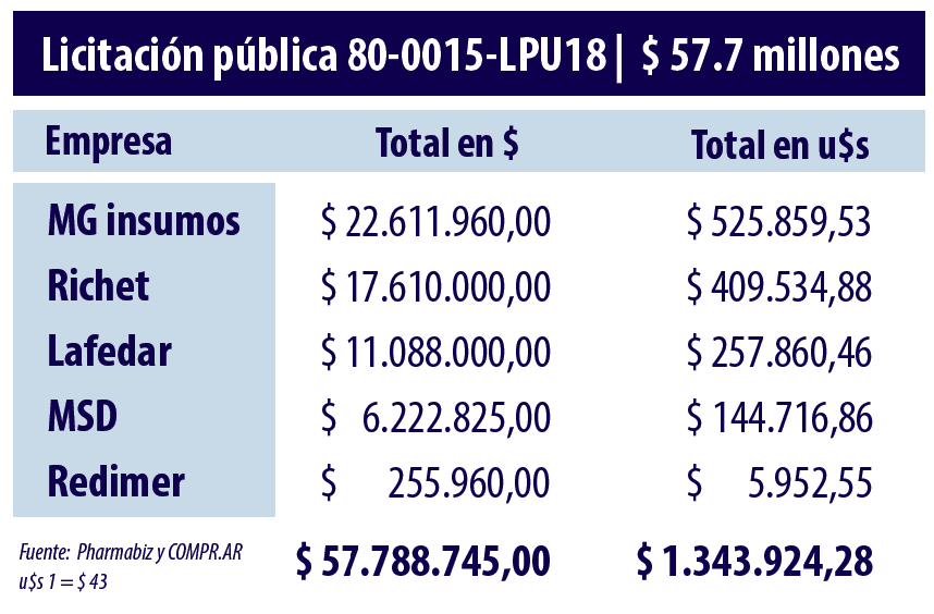 La única multi que fue de la partida fue la norteamericana MSD. La empresa cotizó en un solo renglón en el que no tiene competidores. Si lo gana podría generarle ingresos por $6.2 millones (u$s 144.7 mil). En último lugar se ubicó la droguería Redimer que se apuntó en un renglón por $255.9 mil (u$s 5.9 mil).