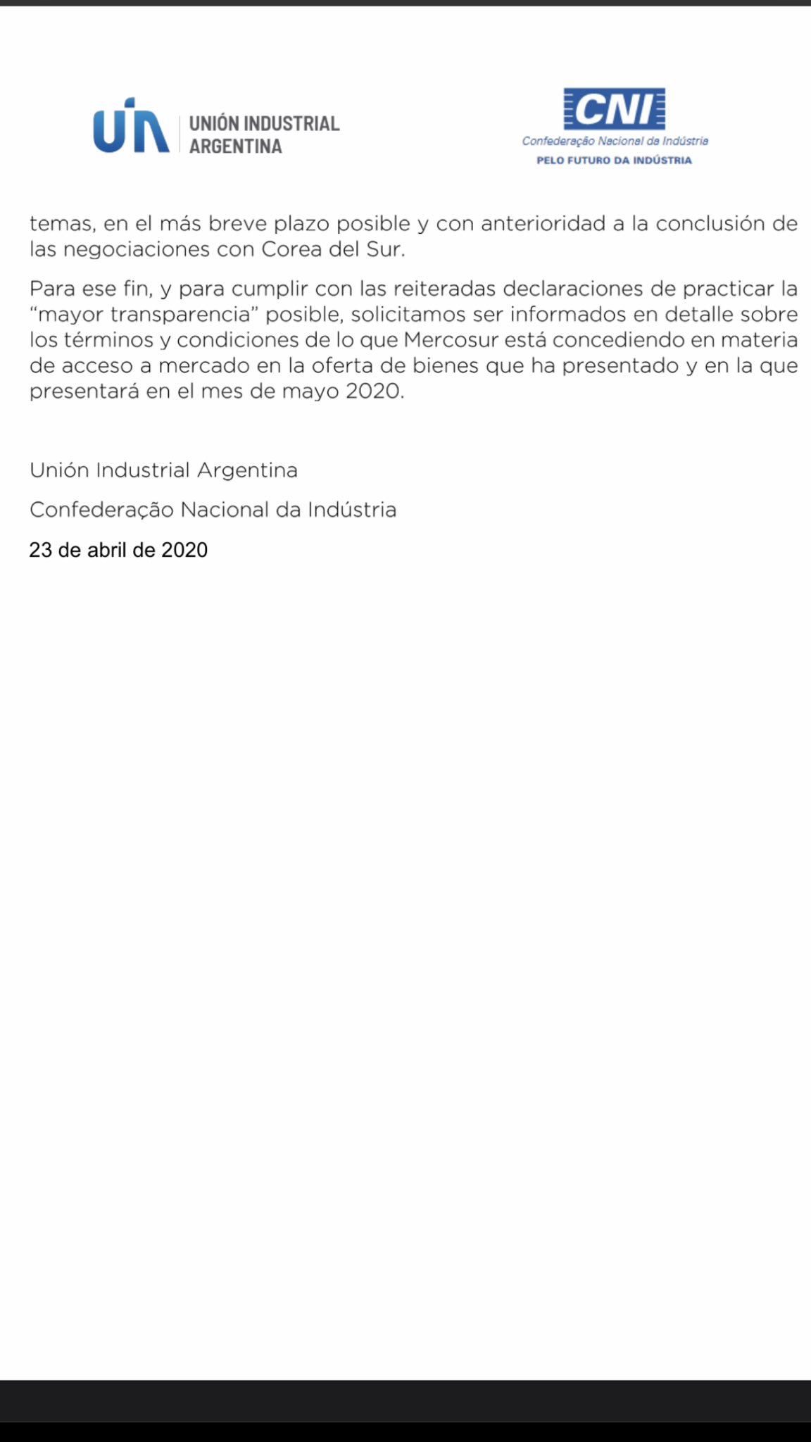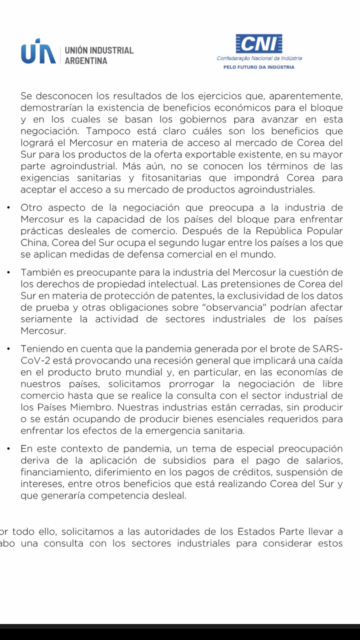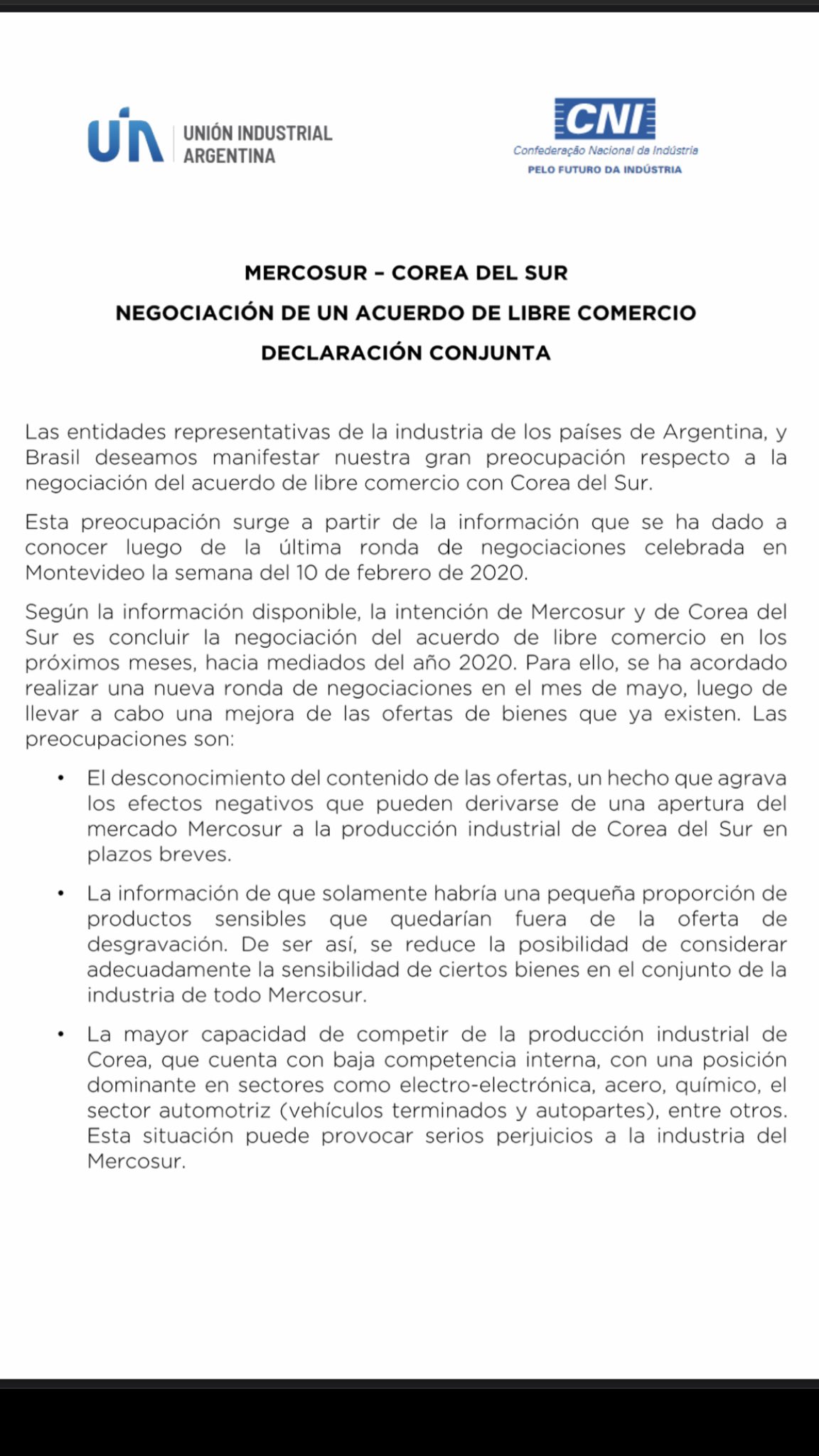 Ahora la UIA elevó su posición al gobierno, junto con los representantes industriales de Brasil enrolados en la CNI, para plantar su postura y expresar la preocupación ante el potencial acuerdo de libre comercio entre el Mercosur y Corea del Sur.