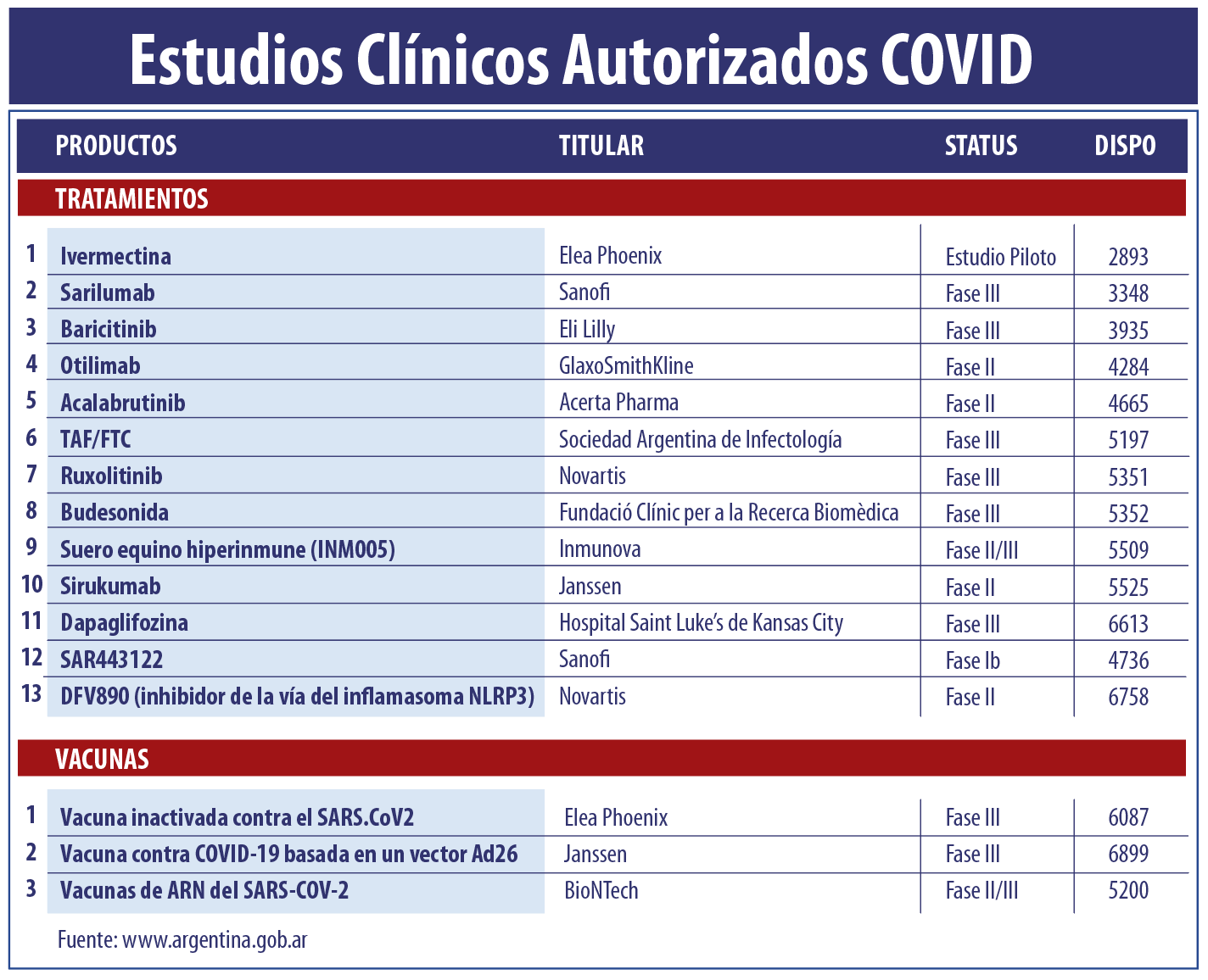 Hasta el momento, la ANMAT autorizó ensayos clínicos para 13 potenciales tratamientos y 3 vacunas relacionadas con el COVID-19, la mayoría de ellos liderados por laboratorios extranjeros. Entre las nacionales, además del estudio de Inmunova, se destacan dos iniciativas que conduce Elea Phoenix y una de la Sociedad Argentina de Infectología.
