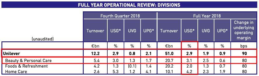 Su división de Belleza y Cuidado Personal mostró un aumento del 3.1% con una facturación total de € 20.7 mil millones. La multi consignó que su marca estrella, Dove le entregó otro año de crecimiento. El segmento de cuidado de la piel se elevó a su vez gracias a nuevas marcas como Love, Beauty & Planet. Ver presentación.