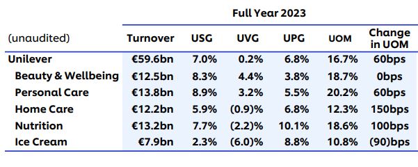 La gigante de consumo masivo Unilever dio a conocer hoy, jueves 8 de febrero, su informe de resultados correspondiente a su año fiscal 2023. La multi británica reportó que en el período sus ventas subyacentes crecieron un 7,0% a € 59.600 millones. Ver Press Release