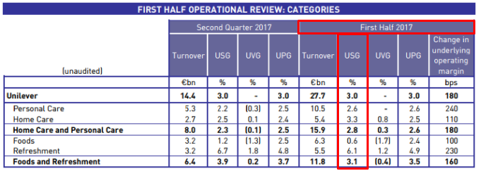 En cuanto a sus unidades de negocios, la que tuvo mejor desempeño fue la de Food &  Refreshment. Allí creció un 3.1% frente a Home & Personal Care, donde ascendió un 2.8%. En Personal Care, las marcas que hicieron mella fueron Dove; Lifebuoy; Sunsilk; y otras.