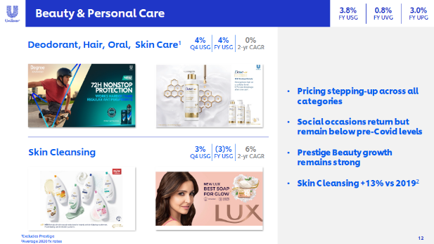 Por su parte, el portfolio de Cuidado del Hogar osciló un 3,9%, por un total de € 10.6 mil millones. Aquí la firma comercializa etiquetas como Cif; Skip en el mercado local; Lifebuoy; Comfort, entre otras. Finalmente, Belleza y Cuidado Personal, que abarca a las marcas Dove; Lux; y Rexona, por mencionar algunas, llegó a los € 21.9 mil millones, y elevó las ventas un 3,8% año contra año. Ver presentación.