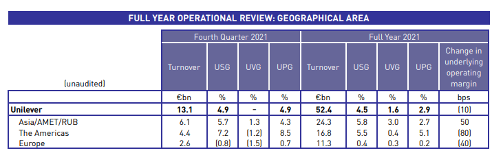 Respecto de su performance por regiones, Asia fue la zona con mejor desempeño, con un 5,8% de crecimiento en el 2021. Americas exhibió un alza del 5,5% y Europa permaneció casi flat, con un 0,4%. En el reporte, la Argentina aparece mencionada como uno de los países donde el volumen se mantuvo positivo, al mismo tiempo que se aclara que se trata de una economía hiperinflacionaria. A nivel local la multi está encabezada por Laura Barnator desde el 2020. Ver artículo «Unilever: una mujer como uno, Argentina».