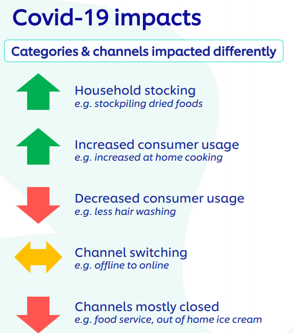 Aunque más tarde las medidas de aislamiento tomadas en cada nación se vieron reflejadas en la performance de ventas, tanto en el stockeo de productos de limpieza y desinfección como en la caída de la demanda de otras categorías. La multi incluso desarrolló un informe en el que detalló a sus inversores cuáles fueron los impactos específicos del COVID-19 sobre su negocio. Ver informe.