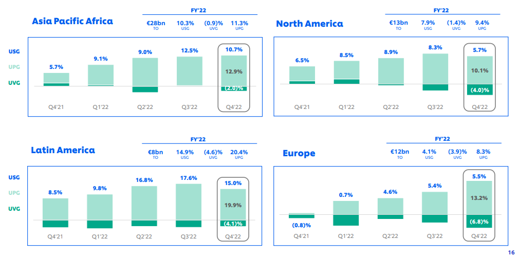 Respecto de su performance por regiones, América Latina fue la zona con mejor desempeño, con un 14,9% de crecimiento en el 2022. Luego, Asia y África también osciló a dos cifras, con un 10,3%, mientras que América del Norte creció un 7,9% y Europa otro 4,1%. En el reporte, la Argentina aparece mencionada como una economía hiperinflacionaria, junto con Turquía. A nivel local la multi está encabezada por Laura Barnator desde el 2020. Ver artículo «Unilever: una mujer como uno, Argentina».