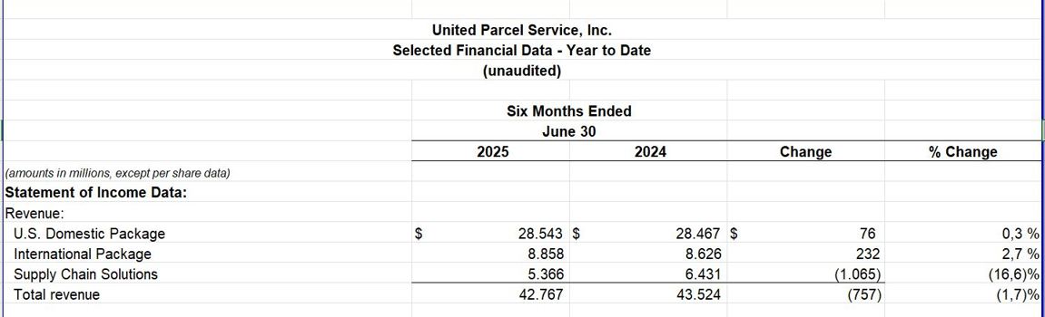 De acuerdo con el documento publicado hoy, martes 29 de julio, en la primera mitad del año, la norteamericana de logística facturó u$s 42.767 millones. Sus tres unidades de negocio presentaron resultados dispares durante el semestre. Ver Press Release